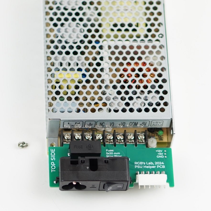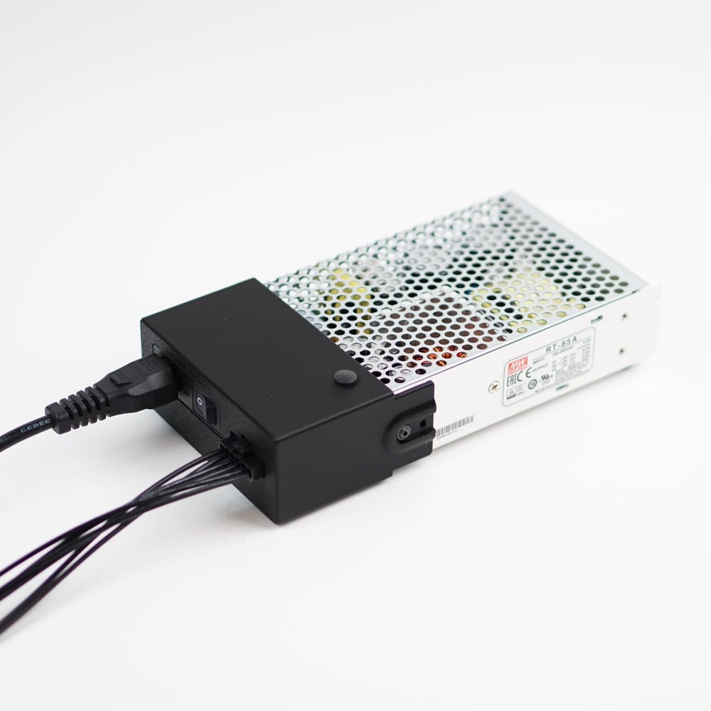 A 3D printed cover for the Mean Well RT series power supplies. It uses a custom PCB with an IEC C5 "cloverleaf" power inlet, a fuse, a switch, and a HAS compatible 6-pin JST-VH connector.